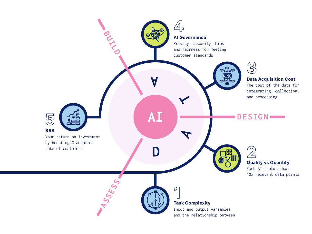 AI is a data-hungry technology, and acquiring enough data can be expensive. Whether you're collecting data through APIs, scraping, purchasing datasets, or building integrations, you need to evaluate the data acquisition cost (DAC). This is crucial so you can calculate the return on investment for each AI feature, and prioritize the feature build in a way that minimizes your overall risk — so you don’t overcommit and underdeliver.