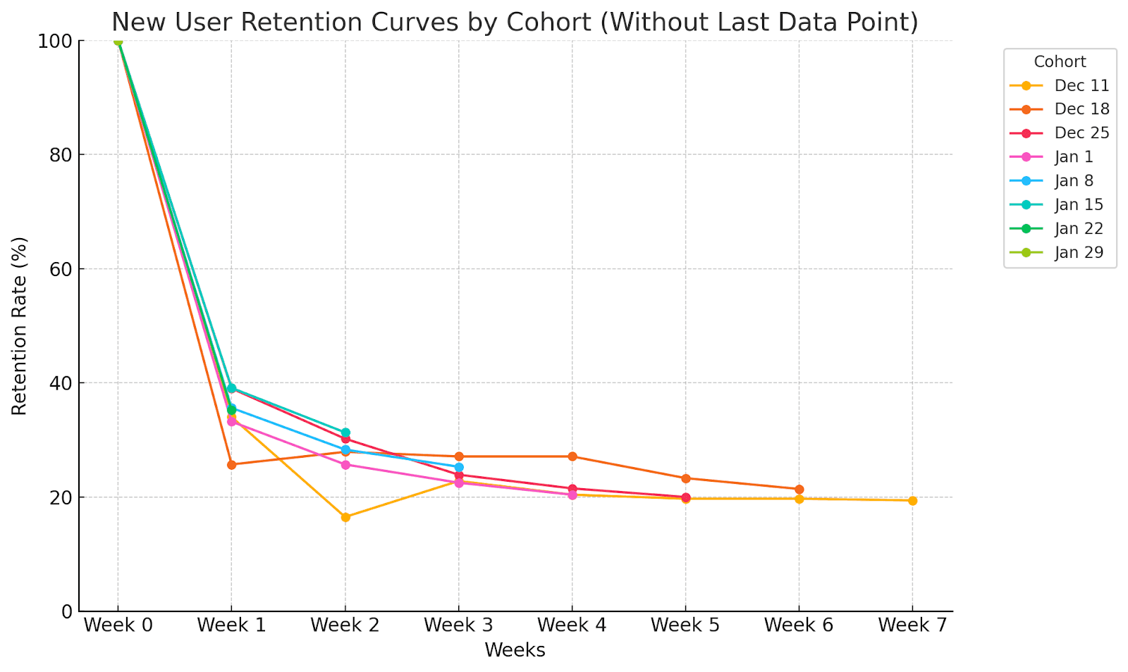 What will happen next, is that some of your new users wil discontinue using the product. But when do they make that decision, and when can you say conclusively that they have stopped using the product? You might not log in to your tax accounting software for a year, until next year’s taxes are due, yet you are using the software as intended. The same for AirBnB. You might not go on holiday every month, but you are a recurring customer. The point is, the frequency at which you measure retention, which should align with your product’s expected usage patterns. Weekly of monthly will often do, but not always.