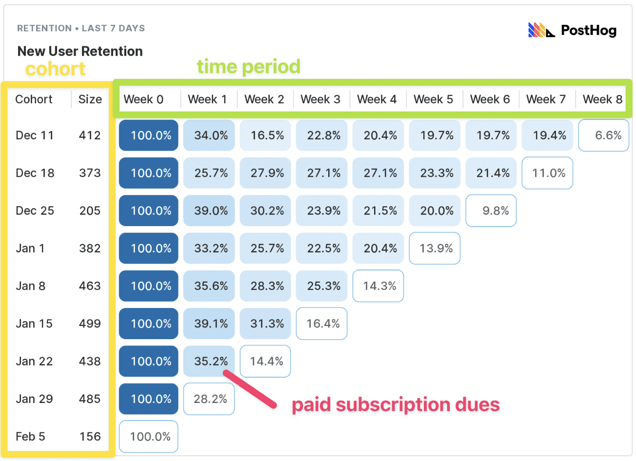 When you have defined these you can start measuring. There are some handy softwares like Posthog can perform these measurements automatically, and after a few weeks your cohort retention table may look like this: