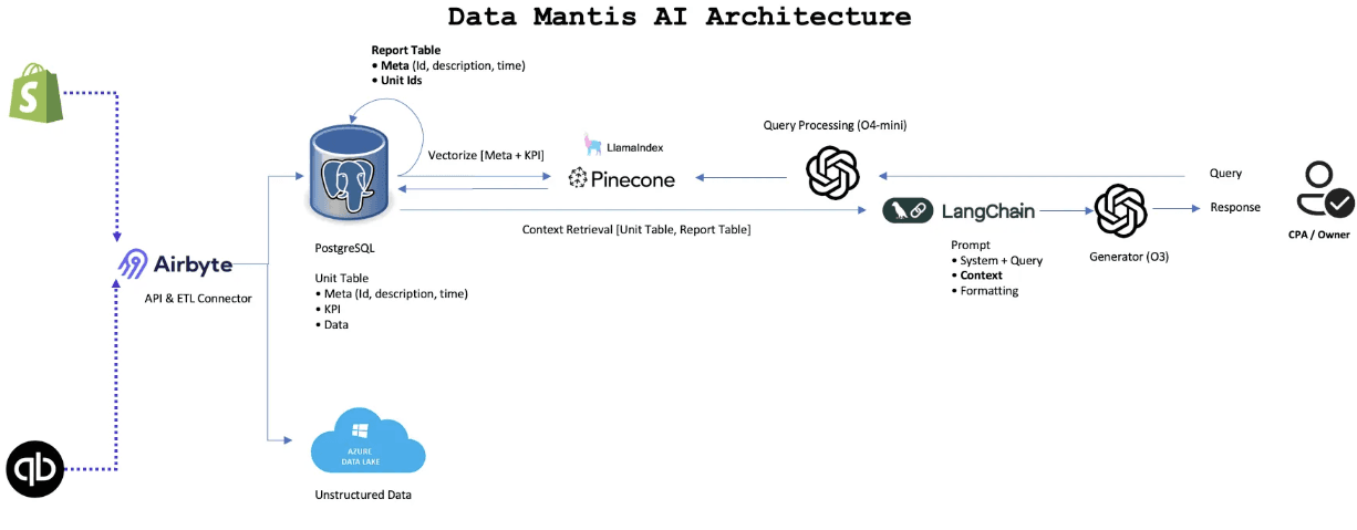 Data Mantis needed to unify heterogeneous commerce and accounting data across Shopify and QuickBooks while maintaining regulatory and compliance constraints. CPA workflows required full traceability from sales to bookkeeping, reliable reconciliation across payouts and deposits, and rapid responses to high-stakes financial questions without excessive token cost or latency.